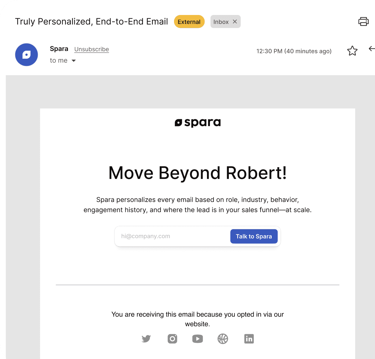 Spara personalizes every email based on role, industry, behavior, engagement history, and where the lead is in your sales funnel—at scale.