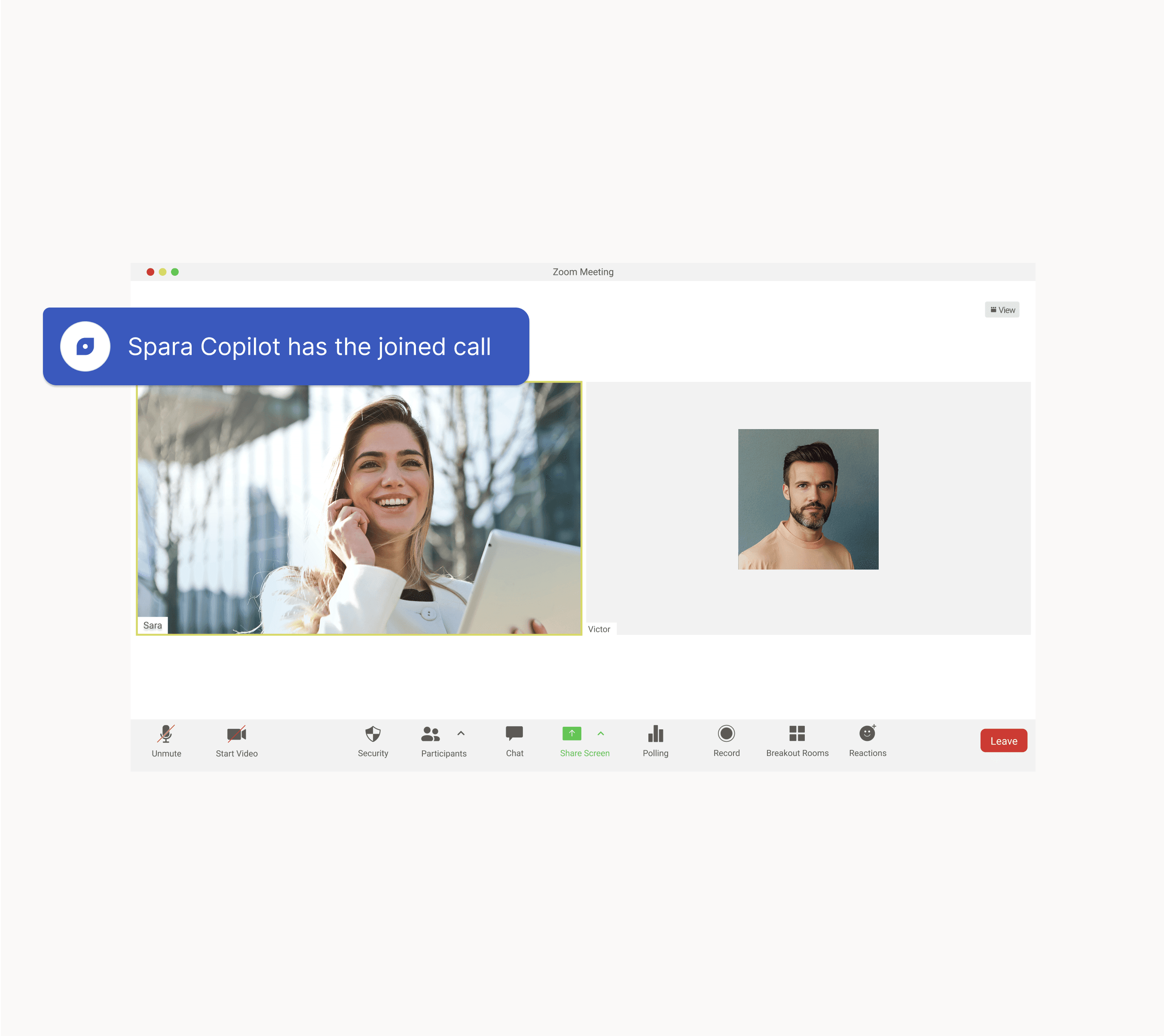 Spara Voice AI can join video conferences as a technical support resources. Sales reps can ask and get answers to technical questions in real-time, speeding up your sales process.